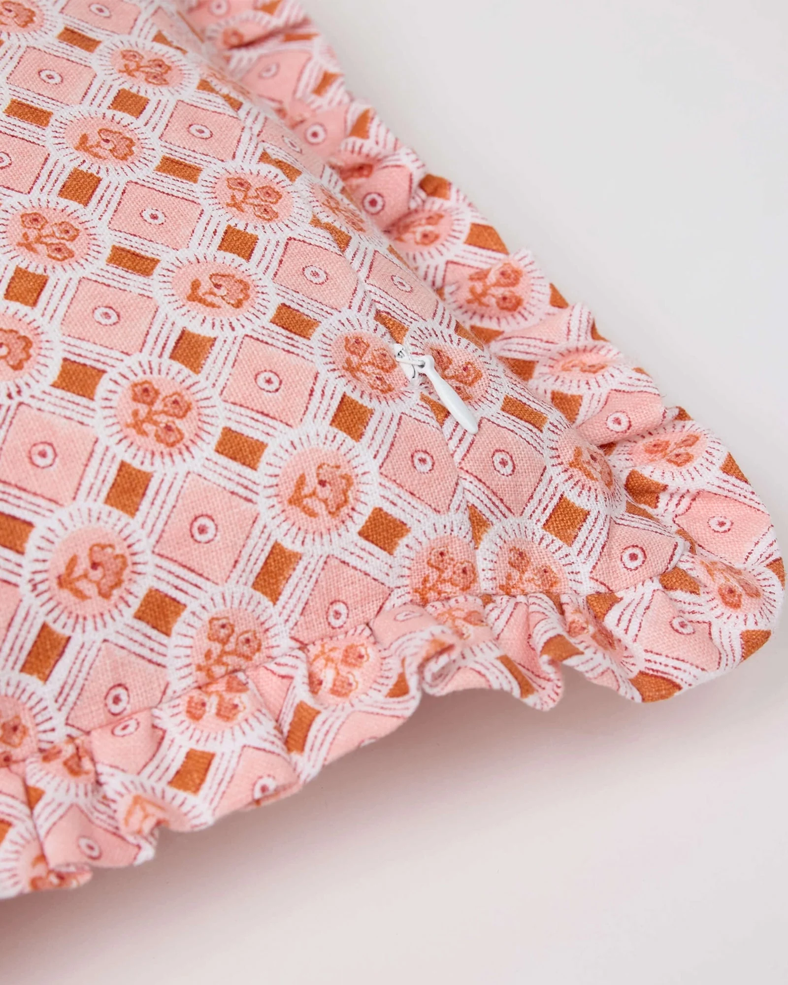 Add a touch of color and style to your living space with our Constance Block Print Ruffled Pillow Cover. This lively piece features a charming ruffled edge and a vibrant hand block printed design in pink and red. Each cover is authentically small batch crafted in India for a unique and authentic touch.