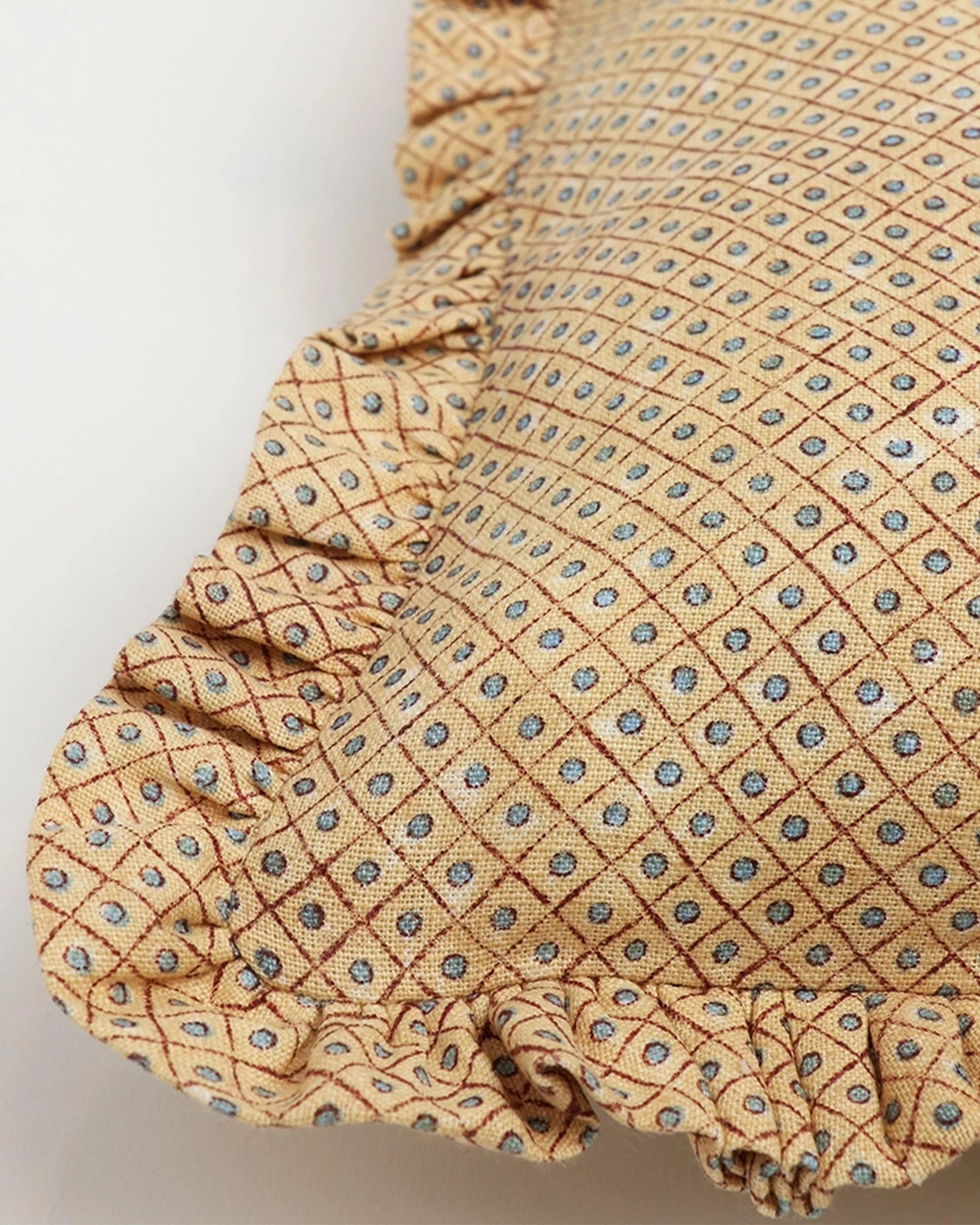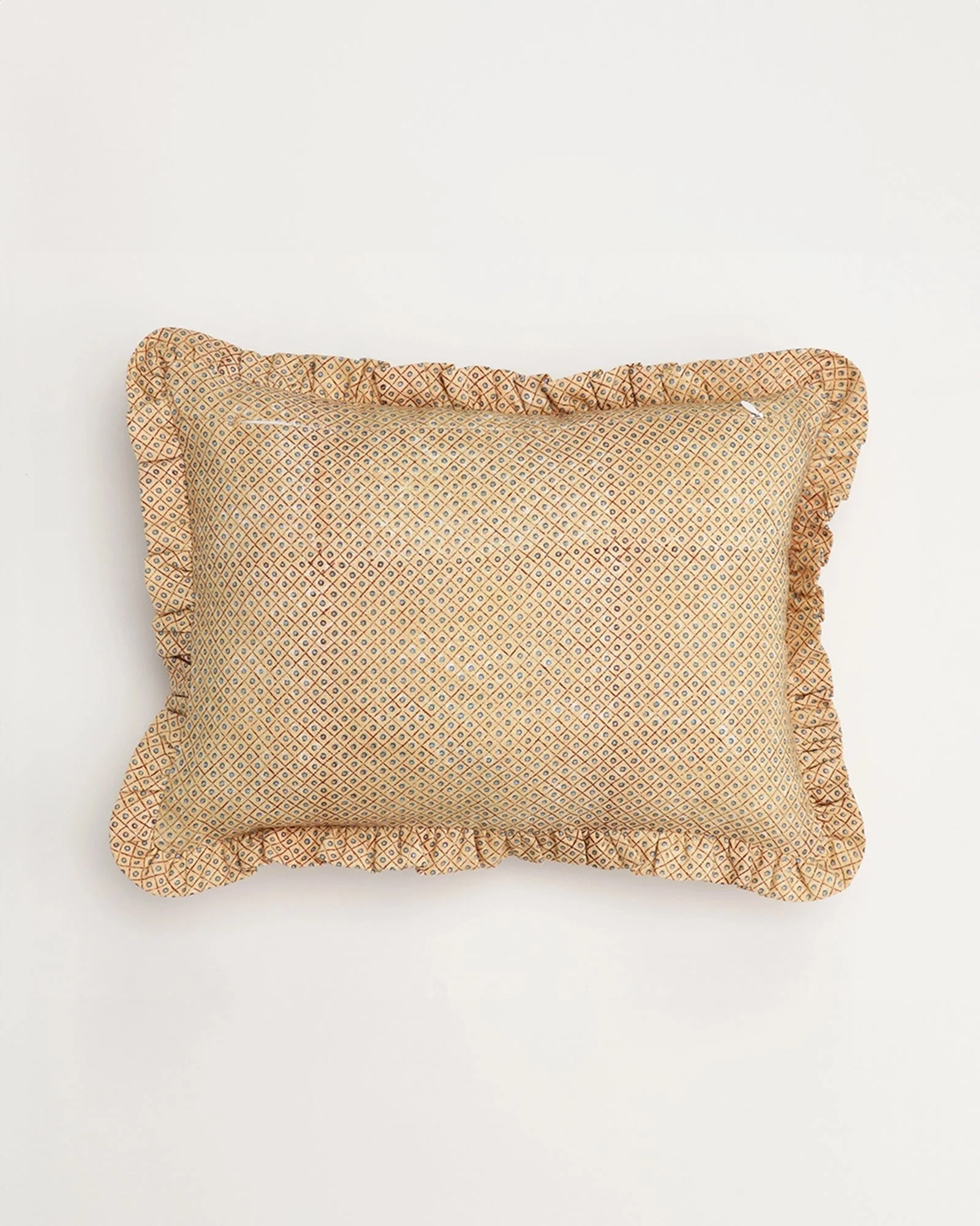 Add a touch of color and style to your living space with our Florence Block Print Ruffled Pillow Cover. This lively piece features a charming ruffled edge and a vibrant hand block printed design in yellow and red. Each cover is authentically crafted in India for a unique and authentic touch.